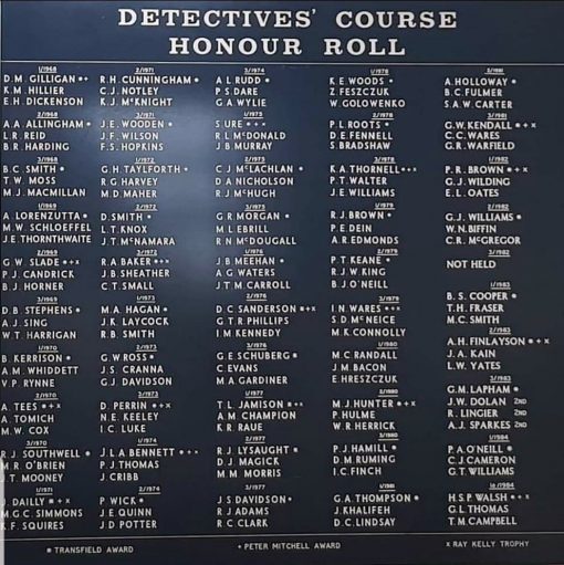 Memorial / Plaque / Monument located at: Placed 1st in Detectives Training Course # 3 of 1974 and received the Transfield Award. His name appears on the Detectives Honour Roll.