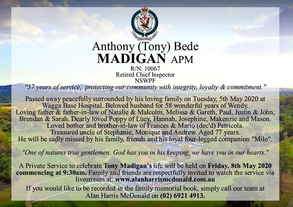 Today our city has lost one of natures true gentleman. A man who served to protect our community with integrity, loyalty and commitment for 37 years. It is with deep sadness that we announce the death of Tony Bede Madigan APM.