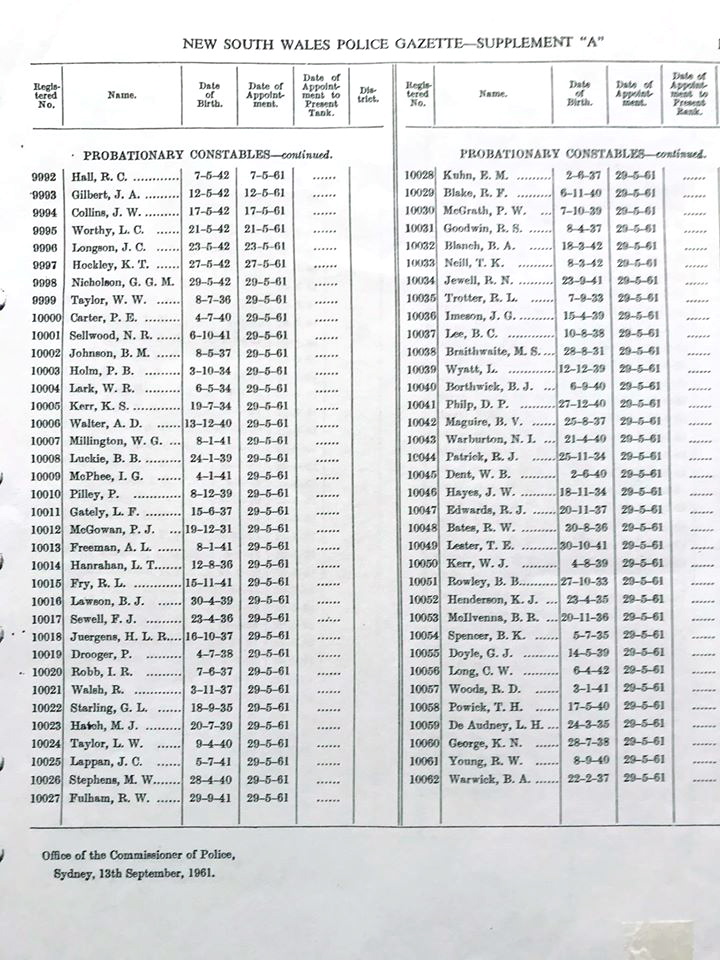 Once Confirmed as ProCst: South District ( 1967 ), Regent St Police Stn – GDs ( 16 June 1961 – 2 August 1962 ), Rockdale GDs ( 3 August 1962 – ? ? 1962 ), Bourke ( Inspectors Clerk & GDs – 1962 ), Young – Lock Up Keeper ( 1970s – SenCon ), Warren ( Sgt – OIC 1978 ), Wagga Wagga ( 1981 – GDs ), Inspector – Team Leader – Management Review Branch ( 1987 ), Senior Service Delivery Assessor – Service Delivery Assessment Branch – Police HQ – College St Sydney ( 1989 – 19 May 1994) – Retirement