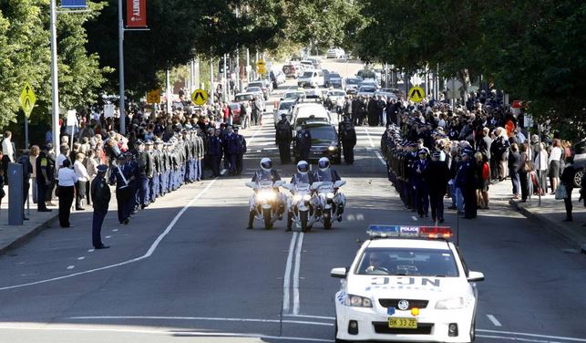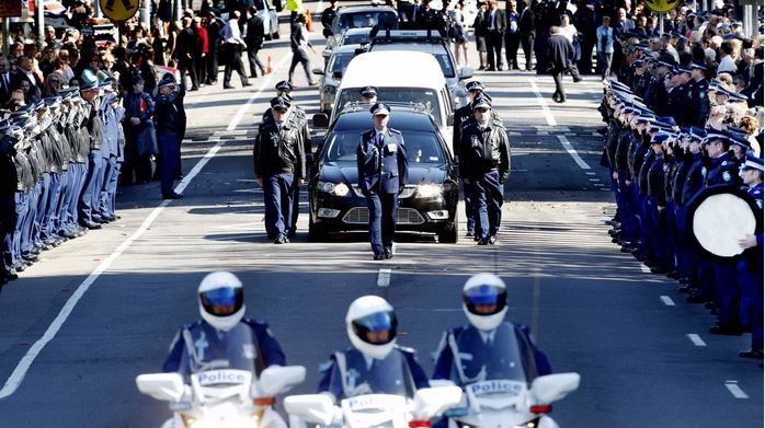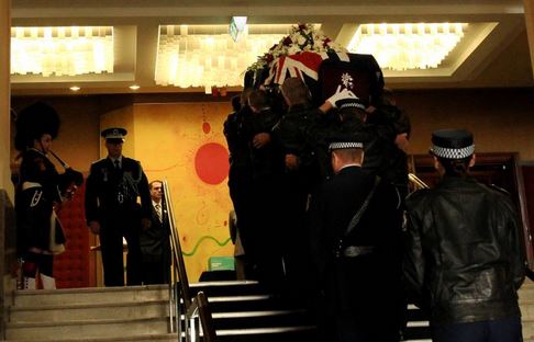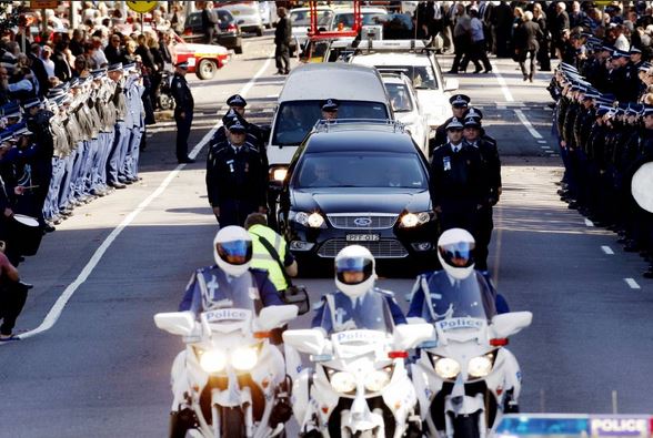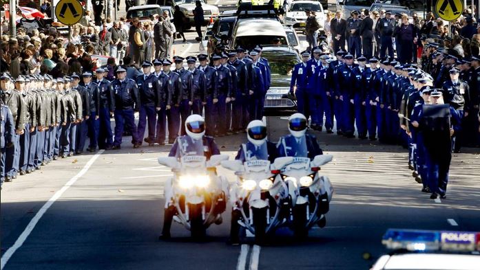 A police helicopter and motorcycles led the procession through a 150-metre long guard of honour along King Street as Senior Constable Tamplin made one final appearance in front of an adoring public.