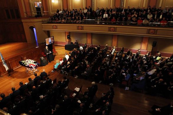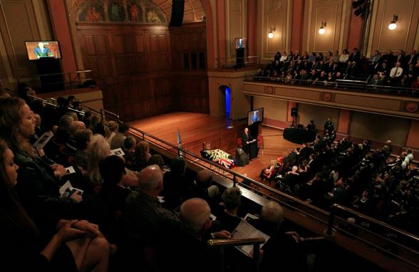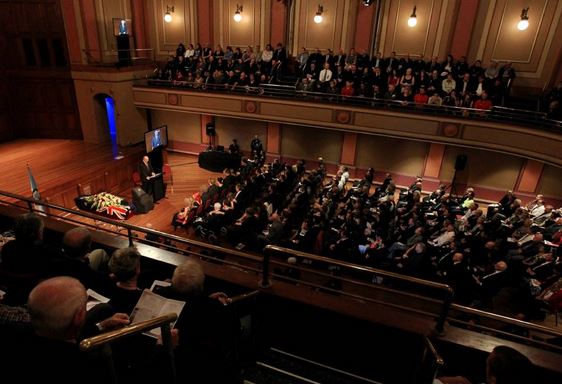 And so the mood of the service, which packed four rooms of the town hall with thousands of people, became a celebration of a brilliant life.
