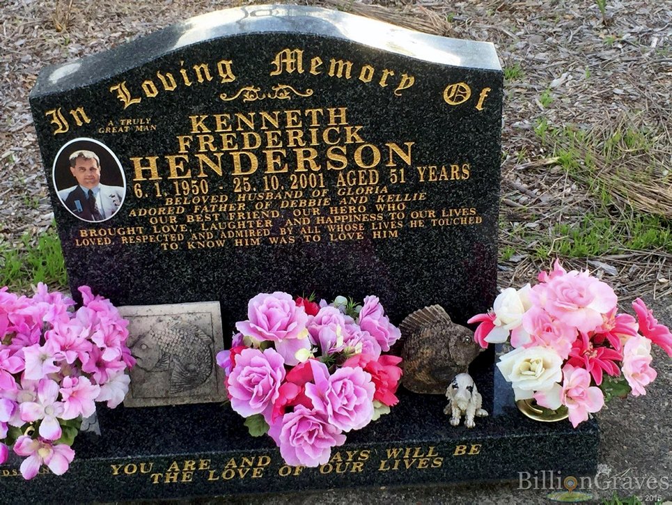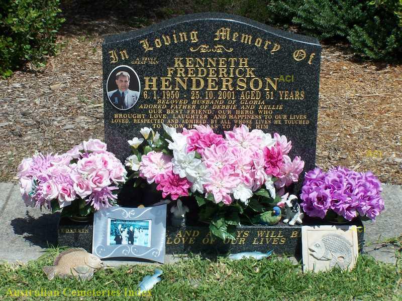 INSCRIPTION: IN LOVING MEMORY OF KENNETH FREDERICK HENDERSON 6.1.1950 - 25.10.2001 AGED 51 YEARS Beloved husband of Gloria Adored father of Debbie and Kellie Our best friend, our hero who brought love, laughter and happiness to our lives Loved, respected and admired by all whose lives he touched to knhow him was to love him Your are and always will be the love or our lives