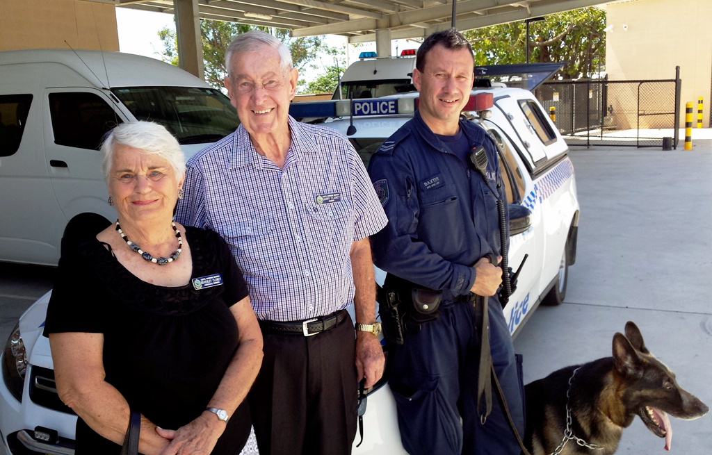 5 March 2015 Police Dog Unit handler Senior Constable Mark Baxter with former Senior Sergeant at the Coffs Harbour Police Station Garry Clancy and his wife Beverley.