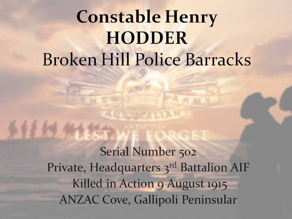 Whilst Hodder was doing police duty on the beach at Anzac during July, a shell exploded in the dug-out almost severing both legs and arms from body. Was sent back to Egypt and believed to have died in Alexandria.