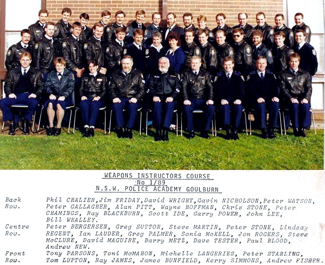Weapons Instructors Course 1/1989 ( January 1989 ) NSW Police Academy, Goulburn Back Row ( L-R ) Phil CHARLIER, Jim FRIDAY, David WRIGHT, Gavin NICHOLSON, Peter WATSON, Peter GALLACHER, Alan PITT, Wayne HOFFMAN, Chris STONE, Peter CHAMINGS, Ray BLACKBURN, Scott IDE, Garry POWER, John LEE, Bill WHALLEY Centre Row Peter BERGERSEN, Greg SUTTON, Steve MARTIN, Peter STONE, Lindsay REGENTS, Ian LAUDER, Greg PALMER, Sonia McKELL, John ROGERS, Steve McCLURE, David MAGUIRE, Barry METZ, Dave TESTER, Paul BLOOD, Andrew NEW Front Row Tony PARSONS, Toni McMAHON, Michelle LANGERIES, Peter STARLING, Tom LUPTON, Ray JAMES, James BUNFIELD, Kerry SIMMONS, Andrew FISHER