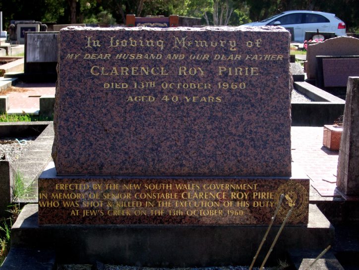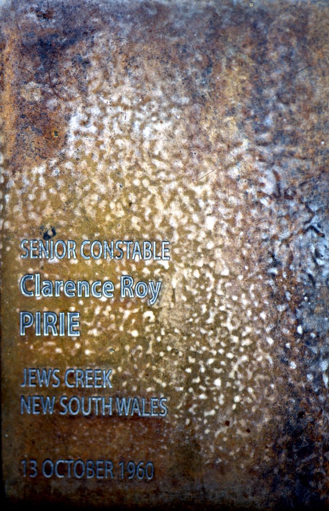 "INSCRIPTION: This plaque has been erected to perpetuate the memory of Senior Constable Clarence Roy PIRIE in recognition of his ultimate sacrifice when he died as a result of gunshot wounds sustained when arresting two juvenile car thieves at Jews Creek on the 13th October 1960.<br />"to everything there is a season and a time for every purpose under the heaven"