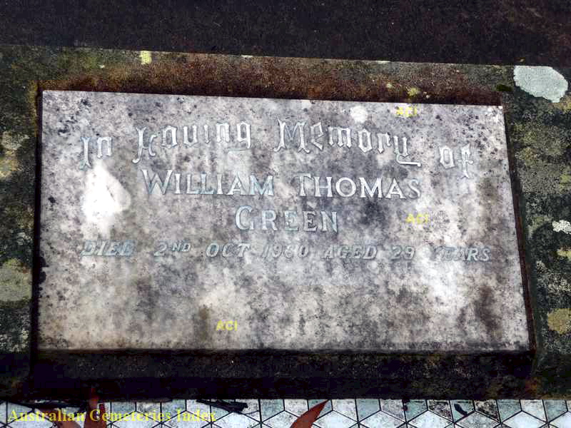 Inscription In Loving Memory of WILLIAM THOMAS GREEN DIED 2nd OCT 1960 AGED 29 YEARS