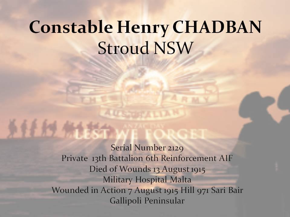 Constable Harry Chadban, who, enlisted from Newcastle, where he was stationed for some months, died on August 13th of wounds received at the Dardanelles. His parents live at Stroud, and he was the first member of the Newcastle branch of the Australian Natives Association to be killed, although about thirty members have enlisted, a great many of whom are already at the front. At a meeting of the branch this week a special minute was passed appreciatively recording Mr. Chadban’s services, and the mortuary allowance of £20 was passed for payment to his next-of-kin.