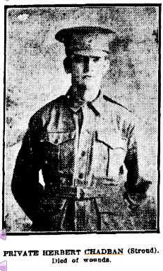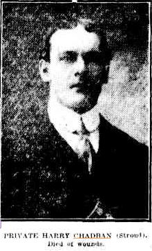 The late Private Henry Chadban, reported killed at the Dardanelles, was 28 years of age, and a son of Mr. and Mars. H. Chadban, of Stroud. In his youthful days, Private Chadban was working about Gloucester, and afterwards went to the Belinger River, where he was engaged in the timber industry.