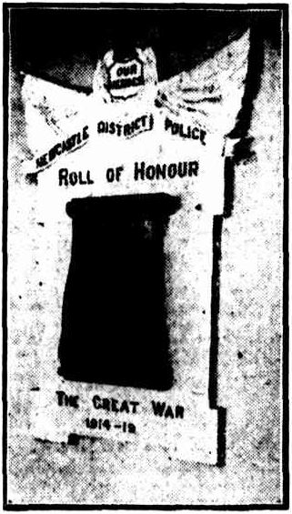 A beautiful marble honor roll, one of the finest of its kind, will be unveiled at the city police station on Wednesday night. The names are inscribed in gold lettering on a black marble scroll, and this is set on a white marble tablet. The roll faces the public entrance to the station, and at present it is draped with the Southern Cross. The words: ” Our Heroes, ” surrounded by a wreath of laurel in bas-relief, with the words ” Newcastle District Police Roll of Honor ” beneath the wreath, are chiselled into the head of the white tablet. At the bottom of the same tablet is chiselled the inscription, ” The Great War, 1914-19. ” So the police apparently believe that the war will conclude next year.
