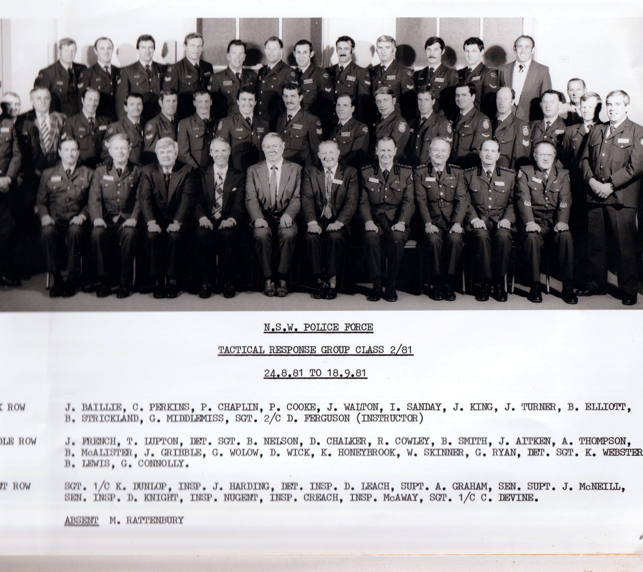 Tactical Response Group Class 2 / 1981 24 July – 18 September 1981 Back Row ( L – R ): J. BAILLIE, C. PERKINS, P. CHAPLIN, P. COOKE, J. WALTON, I. SANDAY, J. KING, J. TURNER, B. ELLIOTT, B. STRICKLAND, G. MIDDLEMISS, SGT 2/C D. FERGUSON ( INSTRUCTOR ) Middle Row: J. FRENCH, Tom LUPTON, DET SGT B. NELSON, D. CHALKER, R. COWLEY, B. SMITH, J. AITKEN, A. THOMPSON, B. McALISTER, J. GRIBBLE, G. WOLOW, D. WICK, K. HONEYBROOK, W. SKINNER, G. RYAN, DET SGT K. WEBSTER, Barry LEWIS, G. CONNOLLY        Front Row: SGT 1/C K. DUNLOP, INSP. J. HARDING, DET INSP D. LEACH, SUPT Angus GRAHAM, SEN SUPT J. McNEILL, SEN INSP D. KNIGHT, INSP NUGENT, INSP CREACH, INSP McAWAY, SGT 1/C C. DEVINE    Absent: M. RATTENBURY