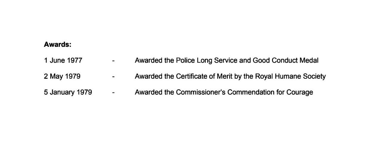 Commissioner’s Commendation for Courage – awarded 5 January 1979