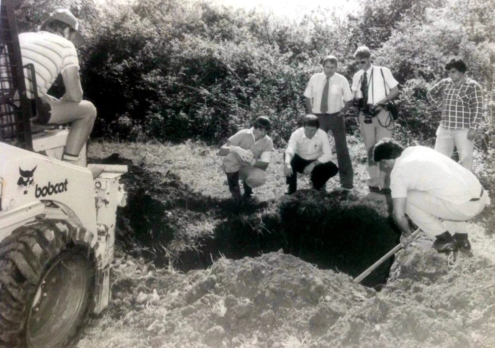 Looking for ” Fine Cotton ” Det.Sgt. Douglas Cecil Bentley ( crouching with black pants ), Det. Sgt. Carl Cameron ( standing behind Bentley ) & Allan Tutt ( crouching with shovel ), exhuming a horse, not Fine Cotton in that hole.