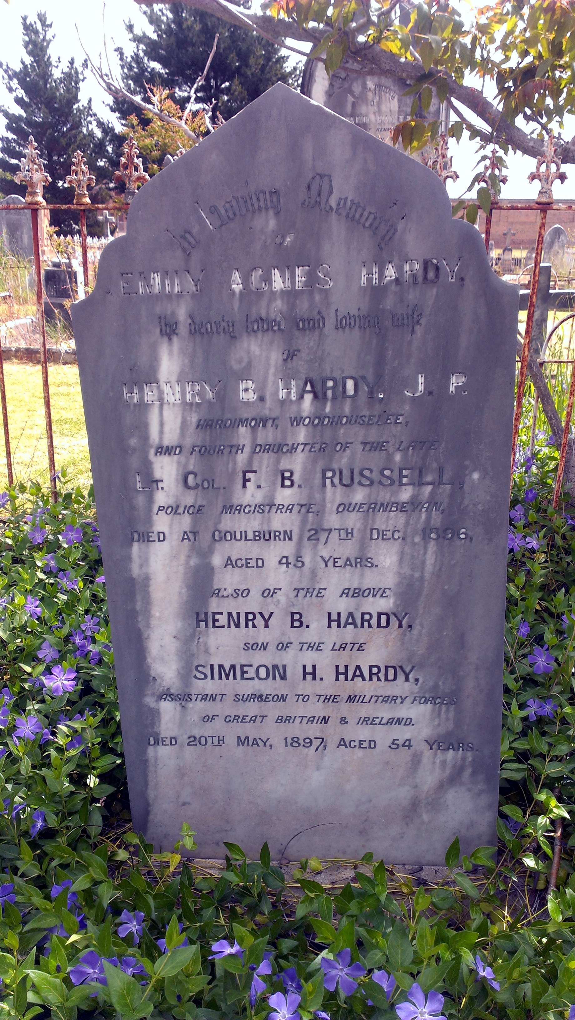 Thank you for the photo of the gravestone of Emily Agnes Hardy, fourth daughter of Lt-Col Frederick Browne Russell (1809-1883), Police Magistrate Wentworth (1864-1869) and Queanbeyan (1869-1883).