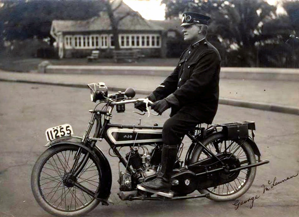 ![http://aaada.org.au/items/?item=5775 Ref:168/97 George McLennan First NSW Police Motor Cyclist [On AJS Motorcycle. Outside Art Gallery Of New South Wales, Sydney] c1915. Silver gelatin photograph, captioned and annotated in ink on image lower right and verso, 14.1 x 19.4cm. Slight tear to right edge of image, minor stains, scuffs and silvering to image, laid down on old backing. Annotations include "Born 2-10-1865, son of John Ross McLennan and Jessie (nee McIntyre). George died 6-11-1932, aged 67. He resigned from police force in 1925. Photographed outside NSW Art Gallery. Old Kiosk in background. It was later demolished to make way for the Cahall [sic] expressway."](https://police.freom.com/wp-content/uploads/2016/10/George-McLENNAN-NSWPF-Died-6-November-1932.jpg)