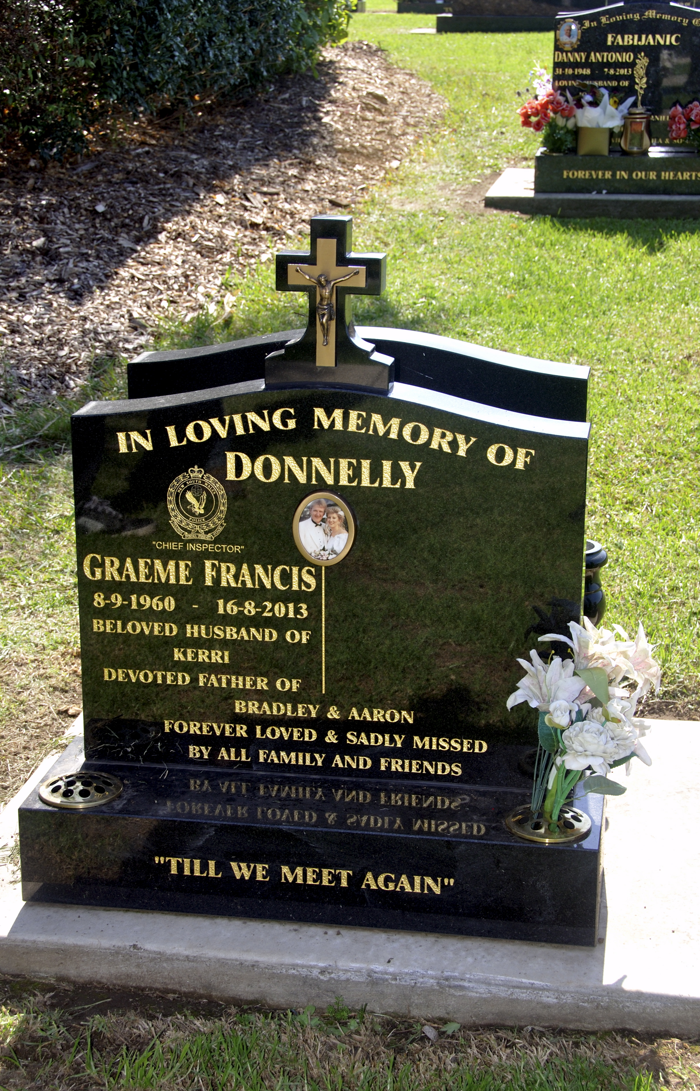 Graeme Donnelly - Grave. Inscription IN LOVING MEMORY OF DONNELLY GRAEME FRANCIS 8-9-1960 - 16-8-2013 BELOVED HUSBAND OF KERRI DEVOTED FATHER OF BRADLEY & AARON FOREVER LOVED & SADLY MISSED BY ALL FAMILY AND FRIENDS "TILL WE MEET AGAIN"