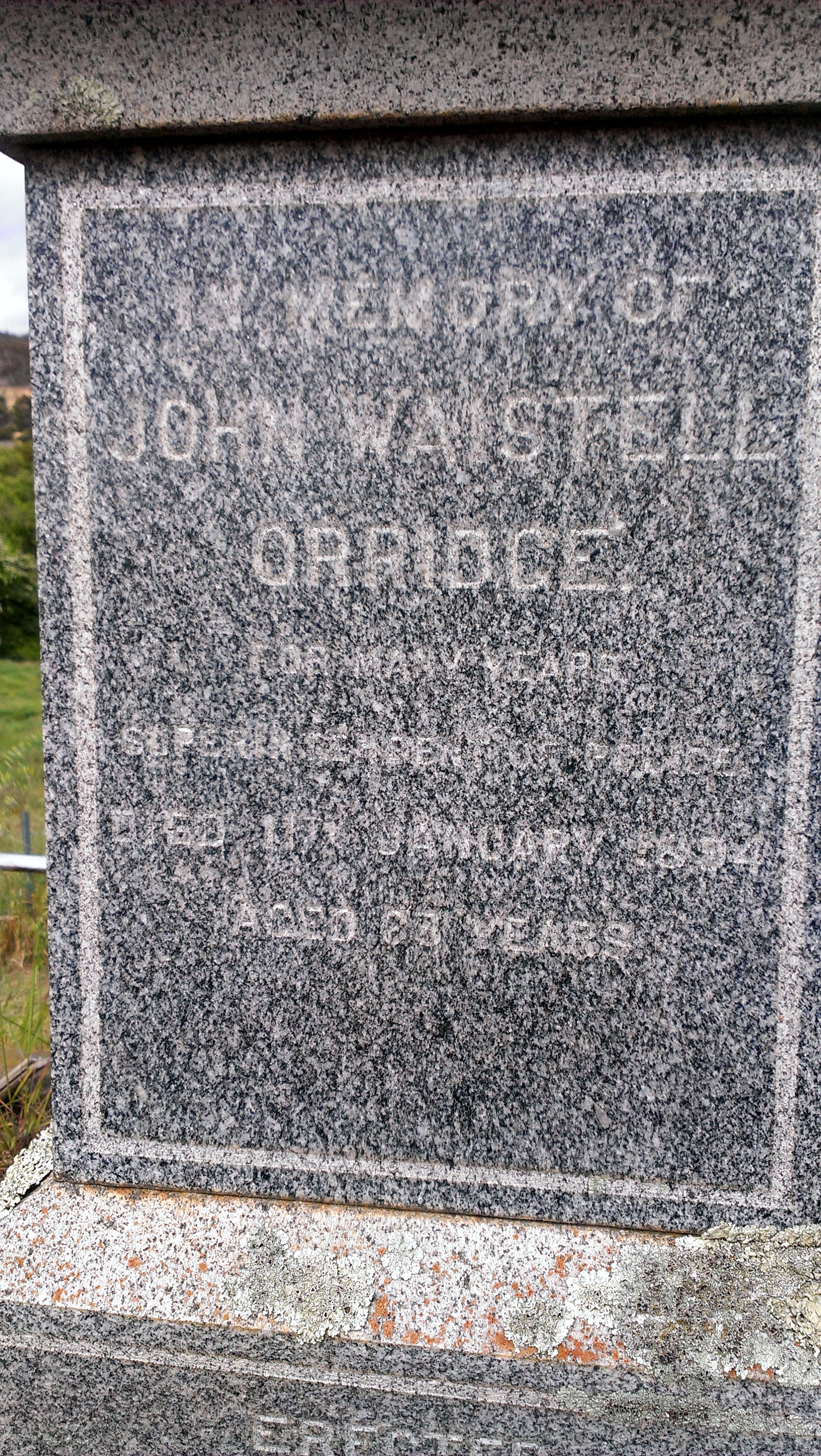 John Waistell Orridge was born at Carlisle, in Cumberland, England, in June, 1830, reached Victoria in 1853, and shortly afterwards entered the police force there, obtaining rapid promotion to the rank of sub inspector owing to his efficiency and courage. When the police force of this country was reorganised in 1862 Mr. Orridge was offered and accepted the position of inspector, being promoted to be superintendent at Braidwood in 1864.