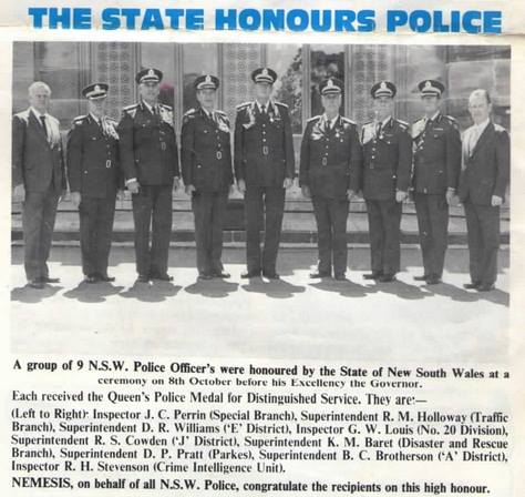 On 9 December, 1974 Detective Sergeant 1st Class Stevenson was shot in the chest after confronting an armed offender in Newtown. Although seriously wounded at the time he continued to direct other police at the scene until he was taken to safety. As a result of the incident Sergeant Stevenson was awarded the Queen’s Commendation for Brave Conduct and the Queen’s Police Medal for Distinguished Service. He was promoted to the rank of detective inspector in 1976.