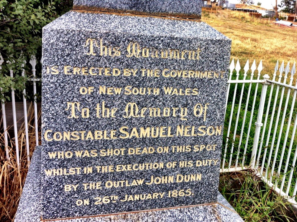 When Mr. Carruthers, in his capacity of Premier, visited the country some time ago, a spot was pointed out to him at Collector, in the Goulburn district, at which Constable Nelson was shot dead over 40 years ago, while assisting in the capture of the notorious bushranger, John Dunn. The then Premier promised that a suitable monument would be erected to mark the spot, and that has just been completed by Messrs. Ross and Bowman, of Pitt-street. It will be unveiled at an early date by the Treasurer, Mr. Waddell. The Metropolitan Superintendent of Police, Mr. Sherwood, has received a photo of the monument, which stands 9ft 6in high. It shows the stump of what “was at that time a tree near where Nelson stood when he received the fatal wound, and another higher stump behind which some of those held up by the outlaws took refuge. The monument bears the following inscription near the base: “Erected by the Government of New South Wales to the memory of Constable Samuel Nelson, who was shot dead on this spot while in the execution of his duty, by the outlaw John Dunn, January 26, 1865.” On the other side are the words, “In memory of a brave officer”.