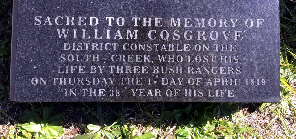 On 1 April, 1819 Constable Cosgrove came upon three men, Timothy Buckley, David Brown and Timothy Ford, and believing them to be bushrangers approached them and enquired where they were heading. The three men suddenly took to their heels, so Constable Cosgrove announced his office and called on them to stop. Buckley then turned around and fired a shot at the constable from the musket he was carrying. Constable Cosgrove returned fire almost simultaneously with his pistol. Unfortunately the musket shot had struck the constable, causing a fatal wound.