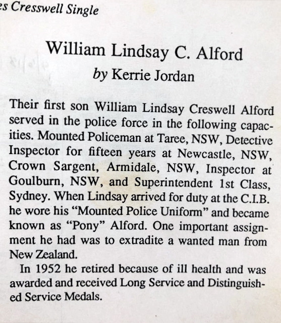 Their first son William Lindsay Creswell alford served in the police force in the following capacities. Mounted Policeman at Taree, NSW, Detective Inspector for fifteen years at Newcastle, NSW, Crwon Sargent (sic), Armidale, NSW, Inspector at Goulburn, NSW, and Superintendent 1st Class, Sydney. When Lindsay arrived for duty at the C.I.B. he wore his "Mounted Police Uniform" and became known as "Pony" Alford. One important assignment he had was to extradite a wanted man from New Zealand.In 1952 he retired because of ill health and was awarded and received Long Service and Distinguished Service Medals.
