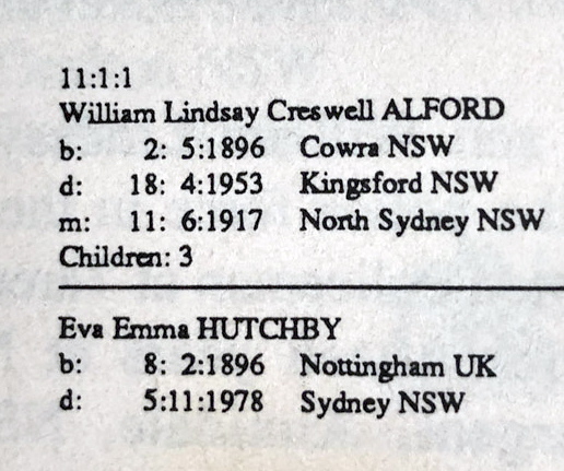 11:1:1William Lindsay Creswell ALFORDb: 2: 5: 1896 Cowra NSWd: 18: 4: 1953 Kingsford NSWm: 11: 6: 1917 North Sydney NSWChildren: 3Eva Emma HUTCHBYb: 8: 2: 1896 Nottingham UKd: 5: 11: 1978 Sydney NSW